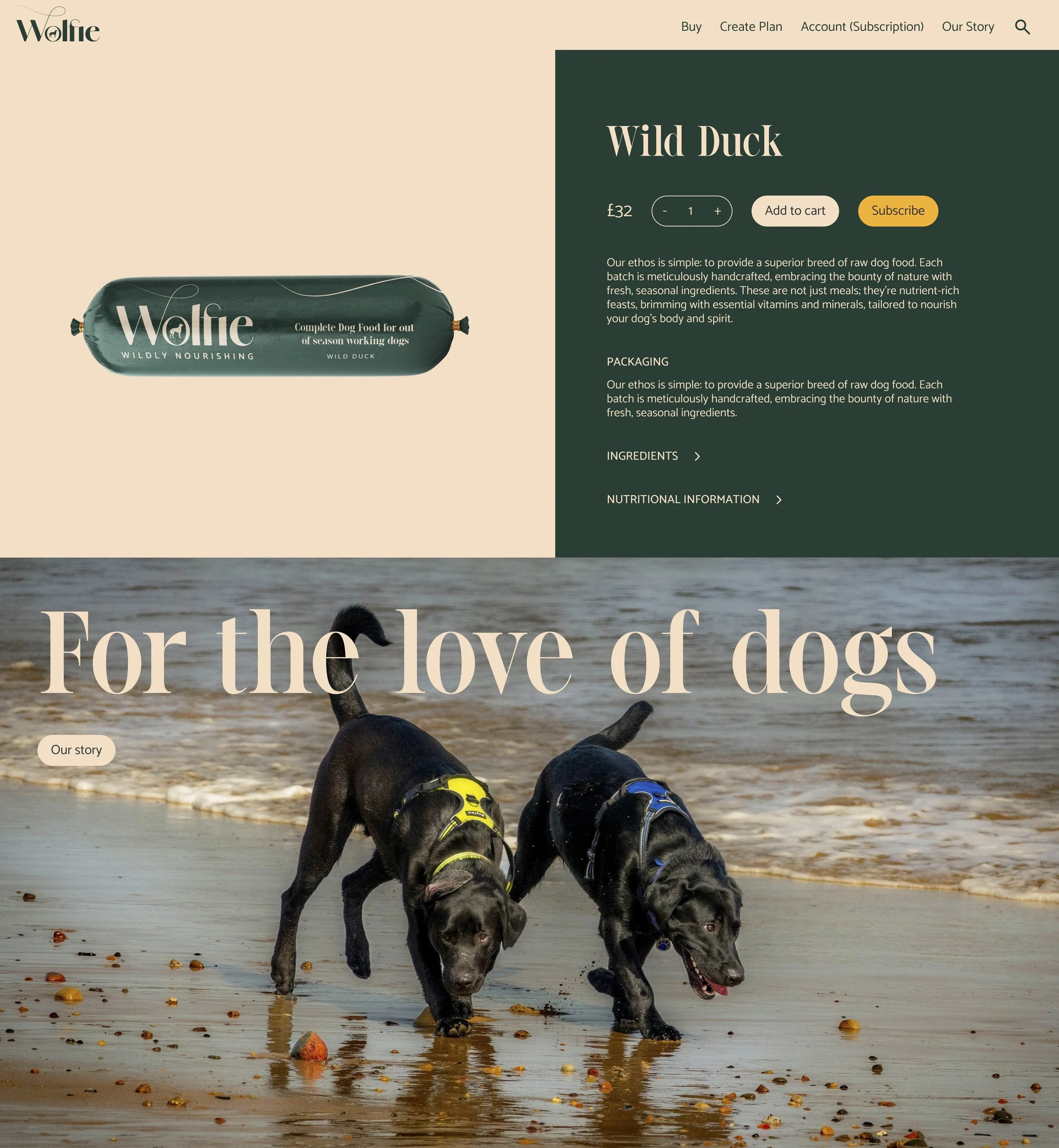 Wolfie is a dynamic company specialising in raw dog food, serving customers across the UK and Ireland. Their brand is characterised by a unique blend of cool, upscale aesthetics and a focus on natural, wilderness-inspired themes, catering to dog owners who value quality and authenticity.